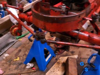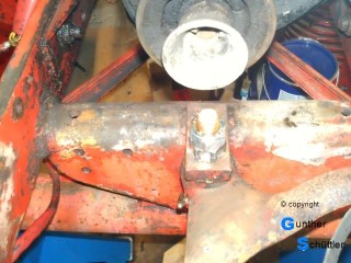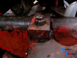 Die Lagerung sass in einer Gabel, der Lagerbolzen war durch spreizbare Enden gesichert, Diese waren so verschlissen, dass sie den Bolzen nicht halten konnten. Der Einfachheit halber habe ich diesen durch eine M20 Schraube ersetzt, das war der minimalste Eingriff in die historische Substanz.