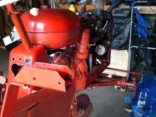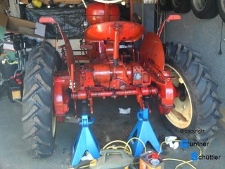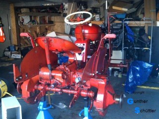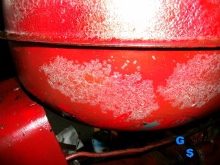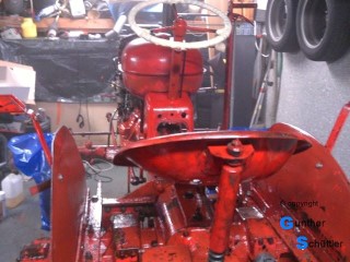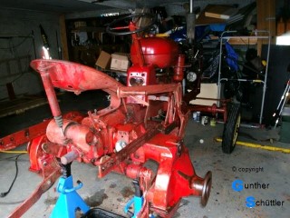 Abgebaute Stücke wurden direkt mit Owatrol eingestrichen und später eingebaut. Dies ergab eine glänzende aber dennoch rauhe Oberfläche. Durch die Kriechfähigkeit hoffe ich auch tief sitzenden Rost erreicht zu haben. Nach dem Zusammenbau sprühte ich den kompletten Schlepper damit ein. Nach ein paar Tagen hatte ich zwar eine feste Oberfläche, jedoch war diese nicht benzinfest. Das ist gerade im Bereich des Tanks ein großes Übel. Überlackierbar war Diese Konservierungsschicht mit Einkomponentenlack. Für die Benzinfestigkeit traute ich auch diesem nicht. Über den Einkomponentenlack kam dann noch eine Schicht Zweikomponentenlack. Und der sollte dann halten Letzendlich sieht der Kleine Schlepper sehr gut aus. Er erzählt gewissermaßen Geschichten aus seiner Zeit.