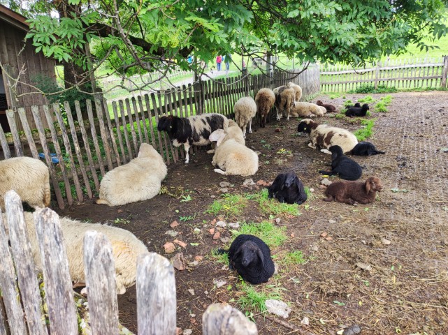 nichts Gutes verheißt. Letztendlich gelang es doch noch einen freien Platz auf dem weiter abgelegenen Parkgelände zu bekommen. Der leicht ansteigende und relativ lange Fußweg zum Museum war schon mit Bauernhoftieren aus Holz mit den dazugehörenden Erklärungstafeln ausgestattet. |
