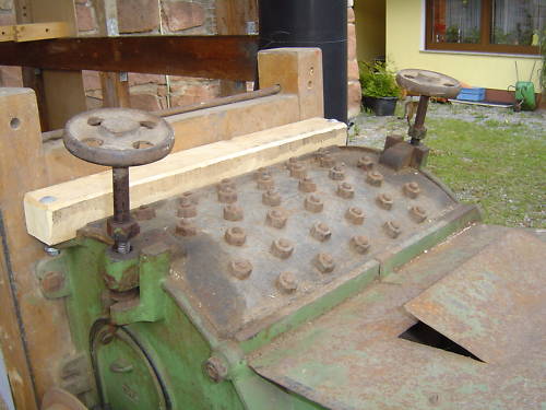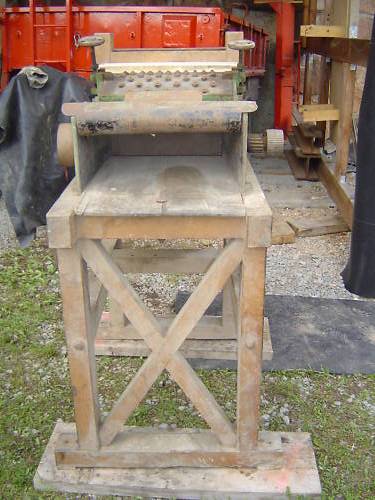 Der StiftendrescherDie Geschichte der Dreschmaschinen begann 1786 in Schottland.Der schottische Maschinenbauingenieur Andrew Meikle baute die erste brauchbare Dreschmaschine nach dem heute noch angewanden Prinzip des Schlagleisten- oder Breitdreschers. Dabei wird das Getreide parallel zur Dreschtrommel zugeführt und von den Schlagleisten der schnelldrehenden Trommel aus den Ähren geschlagen. Etwa 9 jahre später entwickelte der Amerikaner Samuel Turner den Stiftendrecher, eine Maschine die mit der Muskelkraft von 2 Männern angetrieben werden konnte. Das Dreschprinzip war von der bis dahin bekannten Dreschtrommel abweichend. Durch eine Übersetzung wurde die mit Stiften besetzte Trommel auf eine beachtliche Drehzahl gebracht. Das Getreide wurde dann im rechten Winkel zur drehenden Trommel zugeführt. Die Stifte der drehenden Dreschtrommel schlugen die Körner aus den Ähren. Dabei wurde das Stroh in Mitleidenschaft gezogen, es konnte anschliessend nicht mehr effektiv genutzt werden. Stroh, Spreu und Körner landeten auf der Erde und mußten anschliessend noch getrennt werden. Dies geschah in der Getreidereinigung auch als Windfege und Windmühle bekannt. Diese wurden in der Folgezeit mit den beiden Dreschern zu den, bis über Mitte des vergangenen Jahrhunderts benutzten, bekannten Dreschmaschinen kombiniert. Welche Geschichte unser Stiftendrescher hinter sich hat wird wohl ewig im Dunkel der Geschichte bleiben. Wahrscheinlich war er ursprünglich für den Antrieb durch Muskelkraft konzipiert und dann auf Motorantrieb umgerüstet. Wir haben ihn im Spessart erworben, dort sollte er zur Rekonstruktion einer Stiftendreschmaschine benutzt werden. Nachdem Herr Bilz eine fertige Maschine erstanden hatte nahm er Abstand vom Umbauplan, ein Rückbau auf Muskelantrieb wurde wegen der zu erwartenden hohen Kosten wieder fallen gelassen. So kam diese gut erhaltene Teil über ebay in unseren Besitz. |