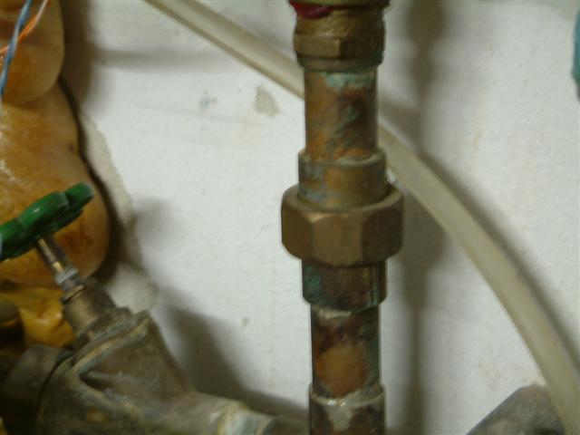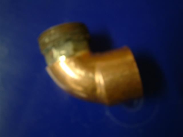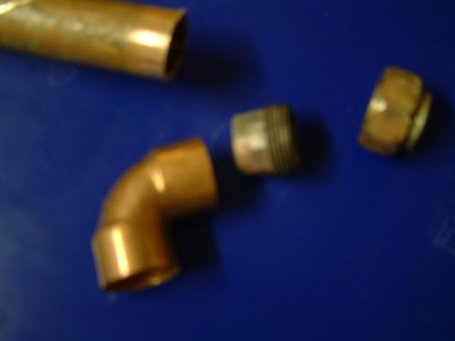 Auf der Suche nach einer Lösung durchwühlte ich auch meine gesammelten Heizungsteile und fand eine Verschraubung für 22mm Kupferrohr die das passende Gewinde vorweisen konnte... Ein 28mm Winkel kurz abgeschnittenund angelötet, die Probeinstallation war ok.....